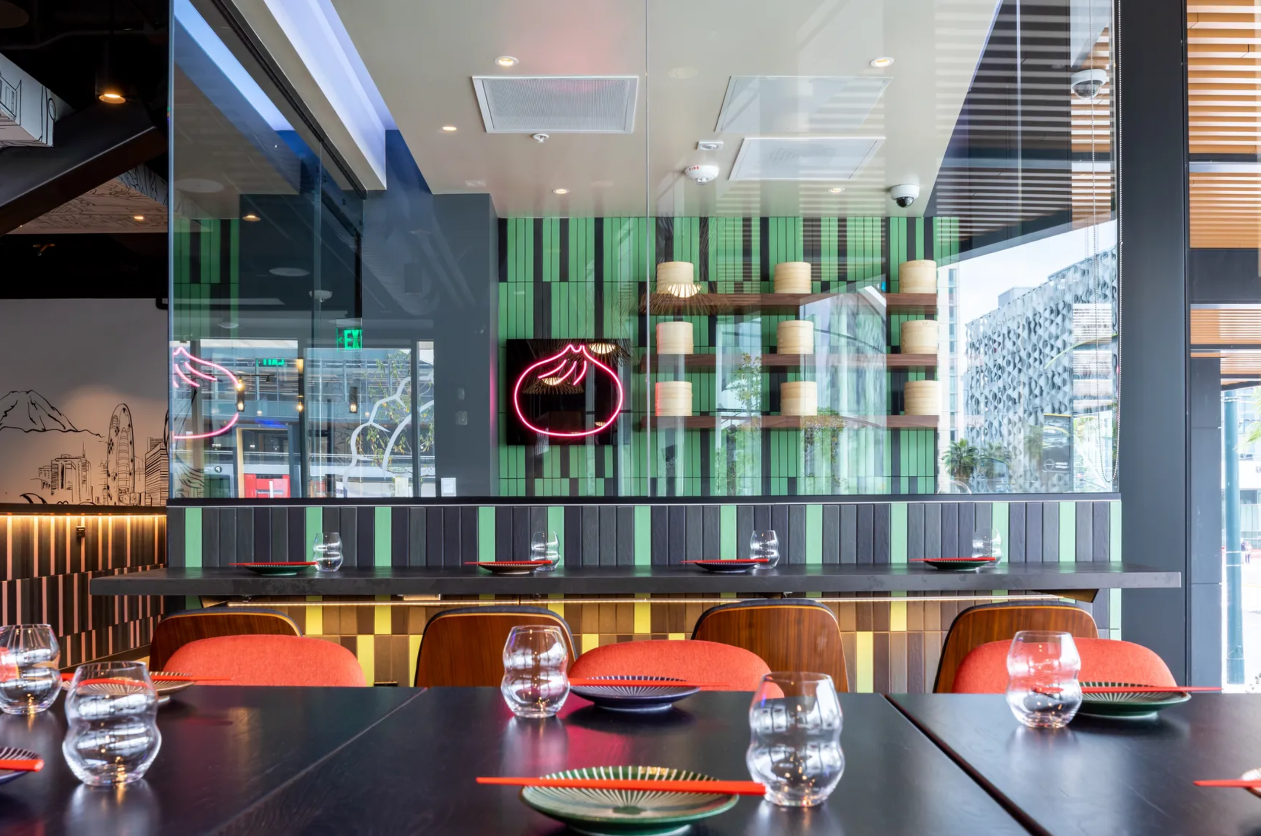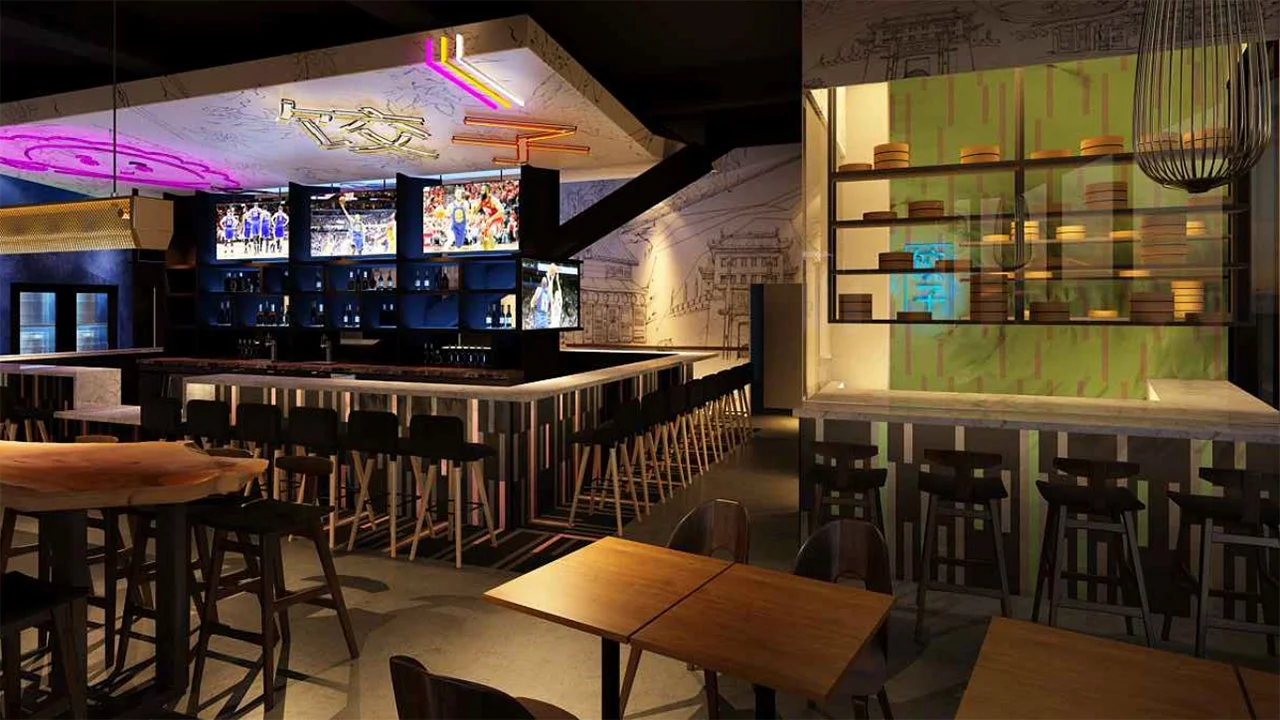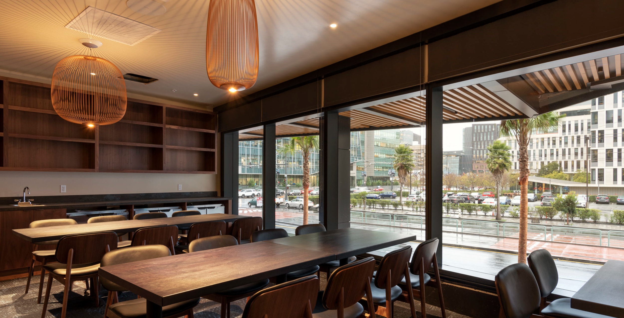Specialty interior and exterior wood slat, fabric, and exposed ceilings